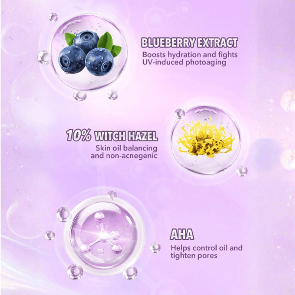 ترکیبات فعال متمایزعصاره آلوئه‌ورا و Witch Hazel.بلوبری (آنتی‌اکسیدان قوی) و AHA (لایه بردار).